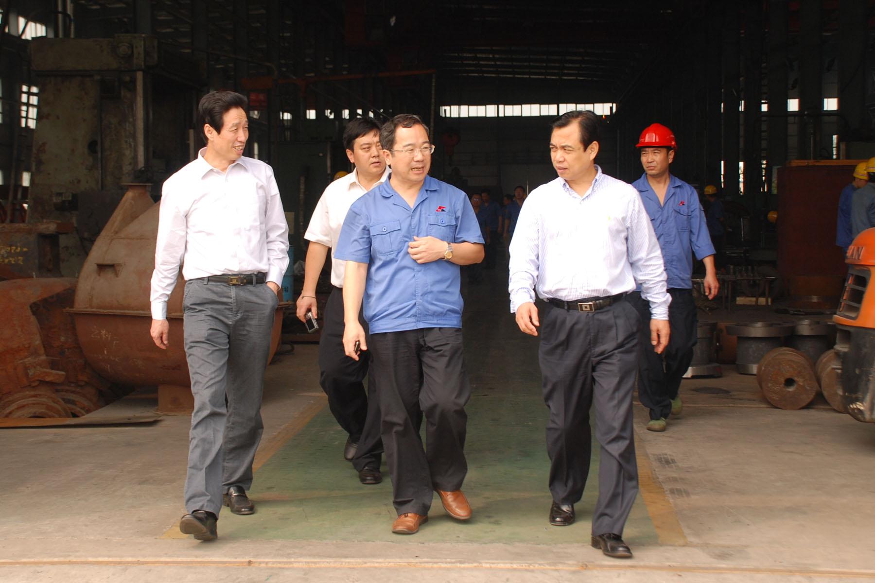 任沁新一行先后到重機廠、金結(jié)廠以及在新廠區(qū)生產(chǎn)作業(yè)的中凱礦機公司、華凱鑄鍛鑄鐵廠現(xiàn)場實地考察。來到一個同行業(yè)的生產(chǎn)現(xiàn)場,他倍感親切,不時地在不同生產(chǎn)設(shè)備及半成品、產(chǎn)成品前和公司董事長侯向保親切交談。